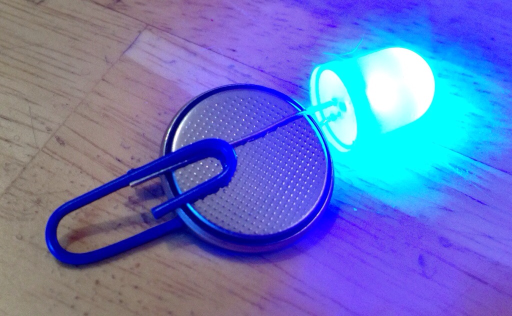 The paperclips actually help hold the LED leads in place; we put tape around them as usual, though that’s not shown in the picture. The plastic coating keeps the paperclip from shorting out the positive and negative battery terminals.